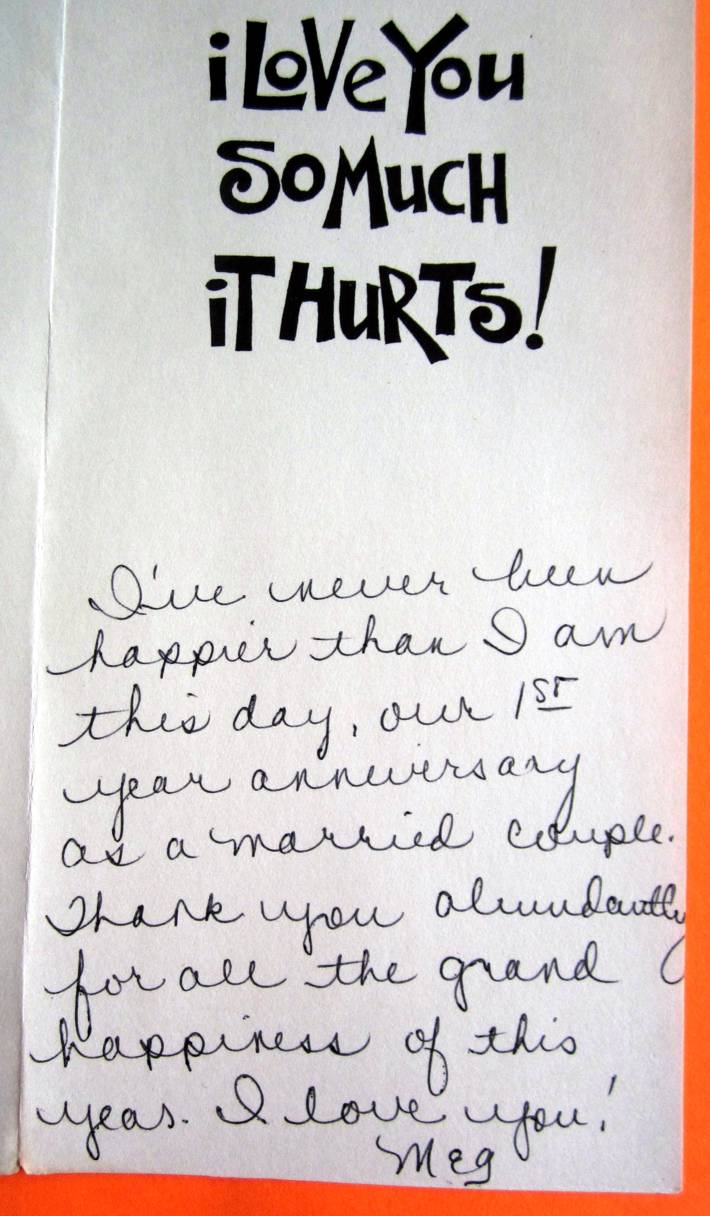 The card reads: “I’ve never been happier than I am this day, our 1st anniversary as a married couple. Thank you abundantly for all the grand happiness of this year. I love you! Meg”