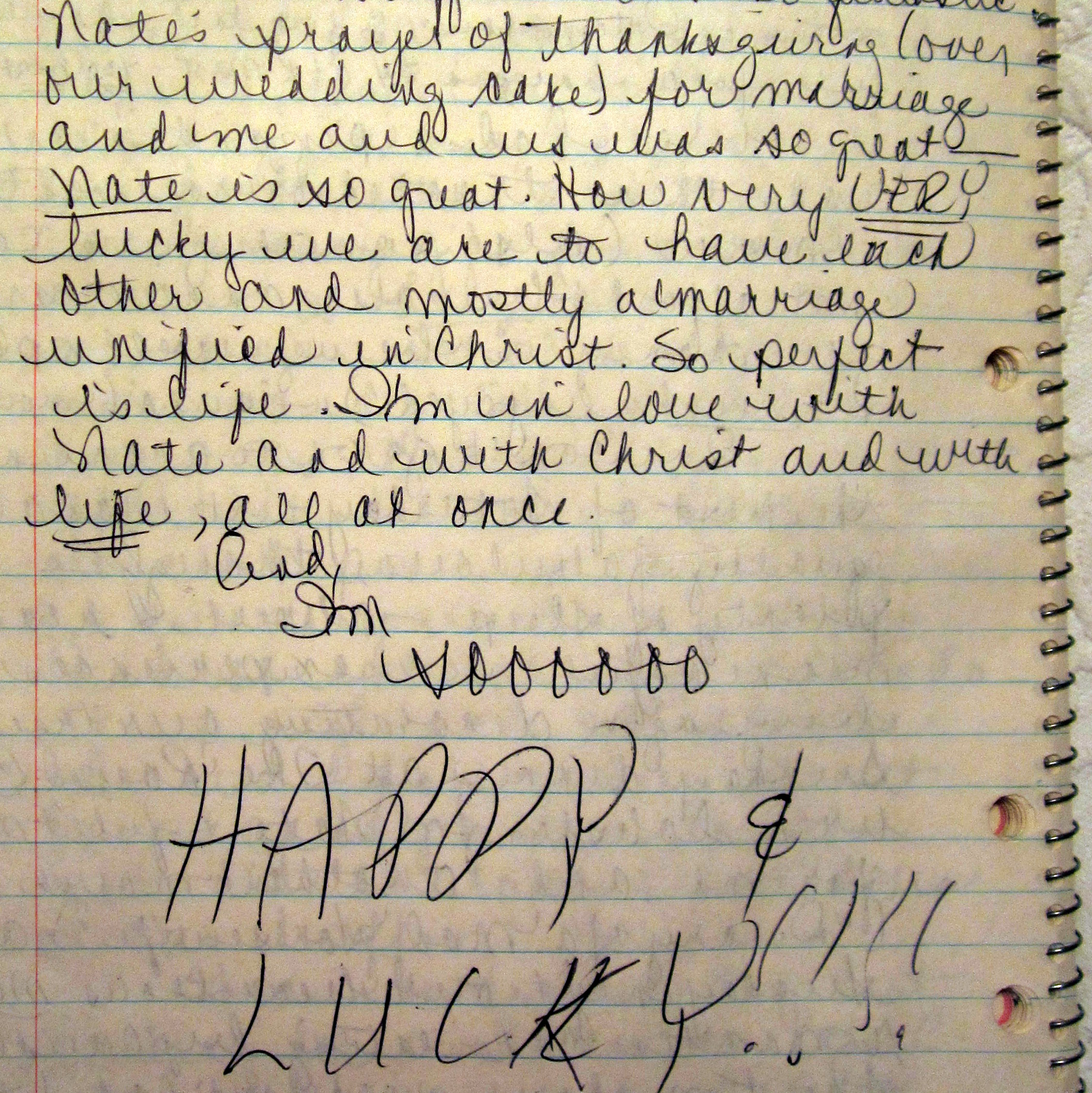 The entry reads: “Nate’s prayer of thanksgiving (over our wedding cake) for marriage and me and us was so great —- Nate is so great. How very VERY lucky we are to have each other and mostly a marriage unified in Christ. So perfect is life. I’m in love with Nate and with Christ and with life, all at once. And I’m soooooo HAPPY AND LUCKY!!!!”