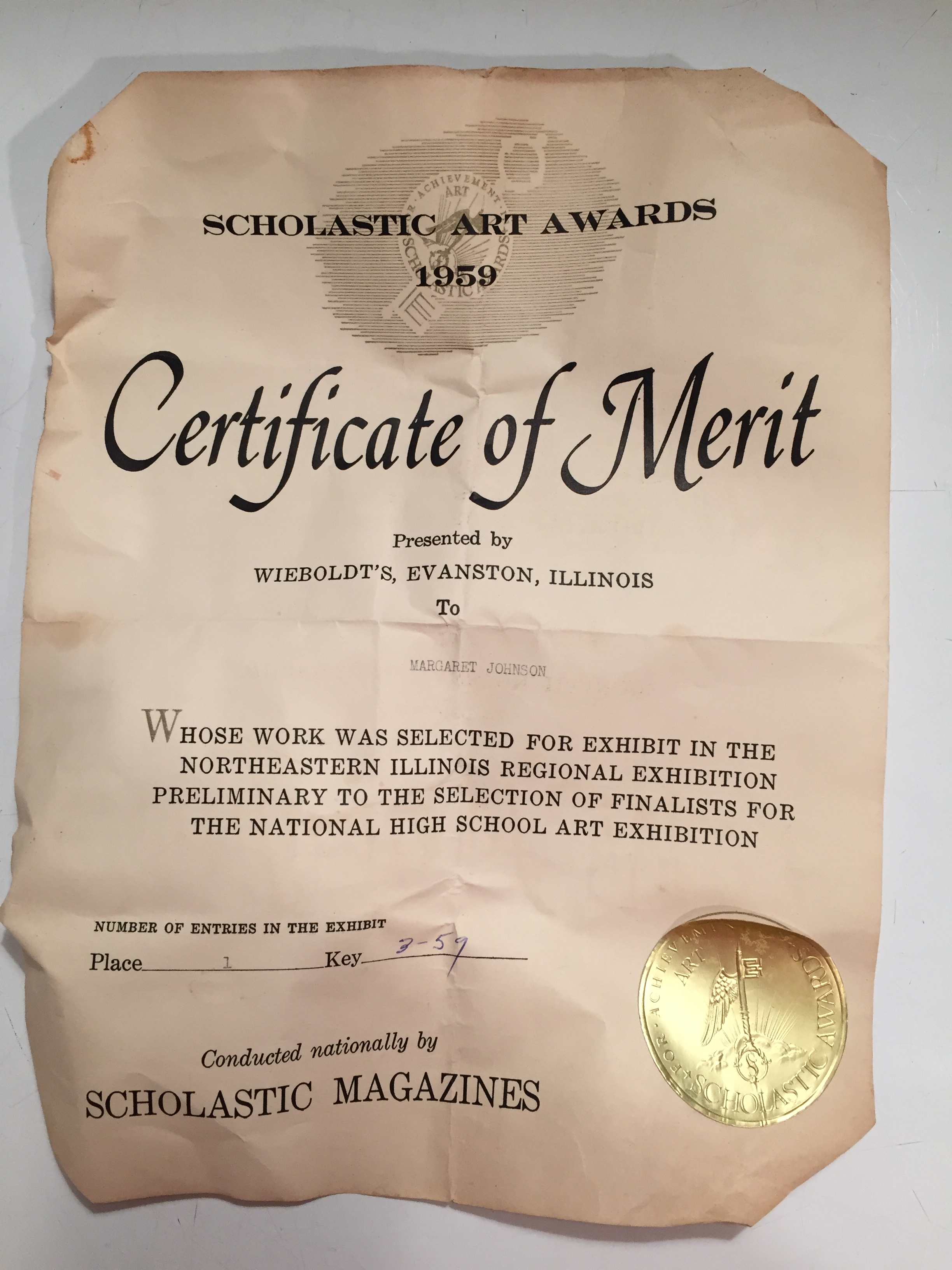 The following weekend my family of five traipsed into a Wieboldts department store nearby and found my cookie jar standing proudly behind glass alongside other entries. And I’d actually won something! Not a blue ribbon or any ribbon for that matter, but a Certificate of Merit. I was delighted, though, because that gold seal awarded me something I’d wanted far more than even a blue ribbon — approval!