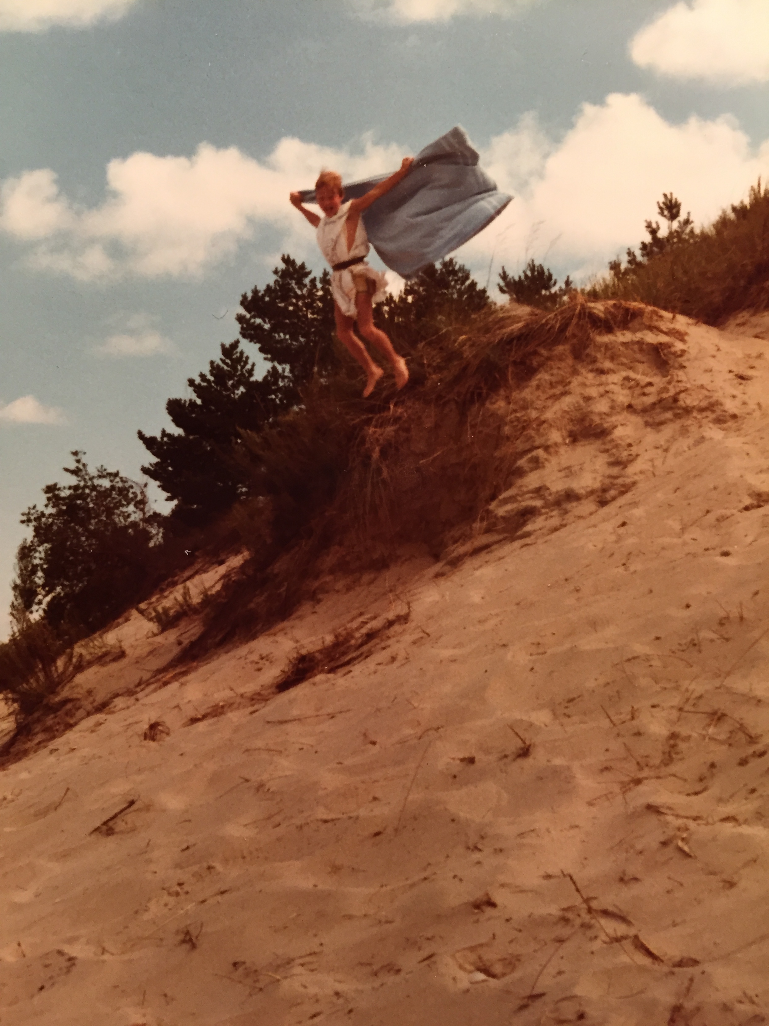 There is one beach activity, though, that’s not quite so easy. Here on the eastern shore of Lake Michigan, we enjoy big silky sand dunes that bring vacationing families from far and wide to play on them. The dunes get a little bigger each year, too, depending on how dry the beach sand is and how stiff the winds. One dune nearby has risen to 260 feet and offers a strenuous workout to get to the top. Then, running downhill is a thrill as gravity morphs footsteps into giant airborne leaps.