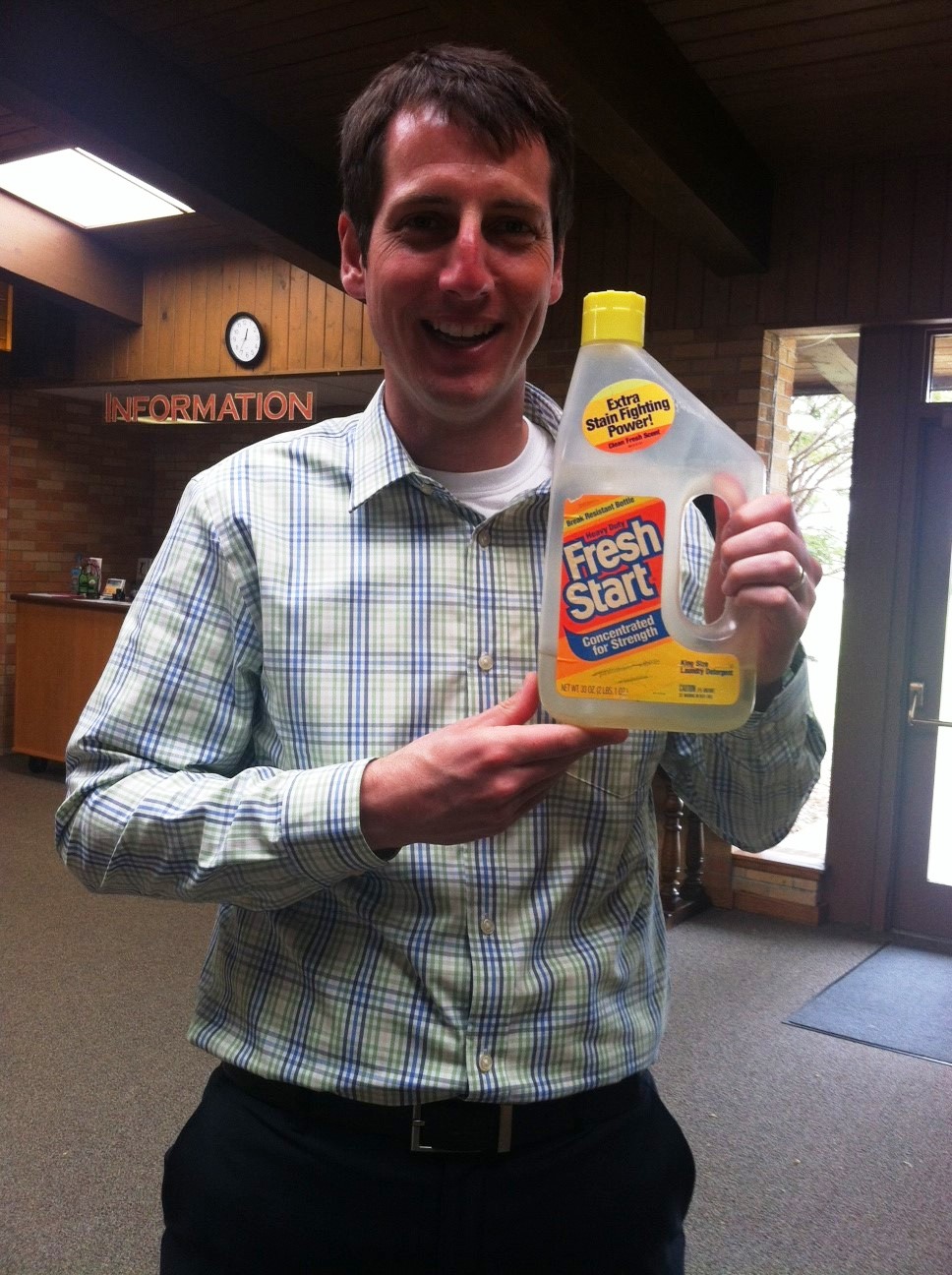 Our God is the champion of heavy duty fresh starts, and the bottle put it well: “Cleans your family’s deepest dirt and many tough stains.” That’s exactly what Jesus does for us when we repent of our sins. The Fresh Start label says, “Extra stain-fighting power! Concentrated for strength!” Jesus says the same about himself, though he deals with stains more difficult to clean than those on our clothes. He cleans the invisible ones on our insides.