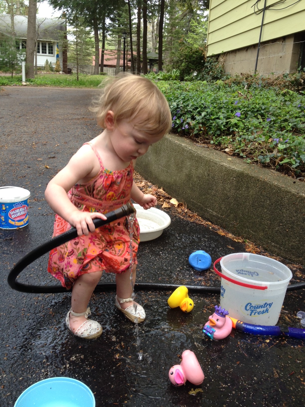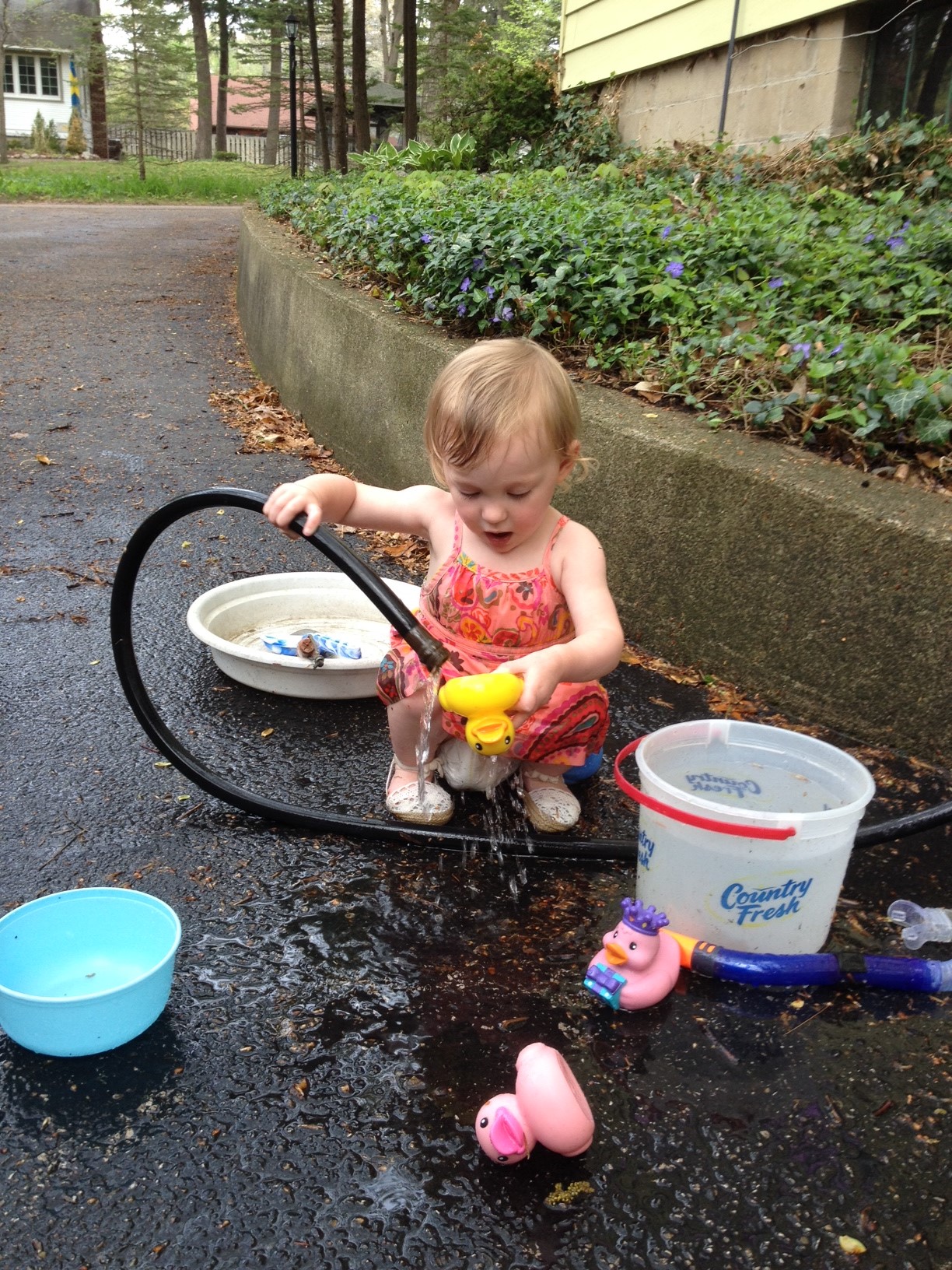 I handed her a couple of buckets, a shovel, and a few rubber duckies, and she was off on a happy adventure. Pulling up a beach chair, I watched her play, a witness to her new discoveries with a hose and its wa-wa.