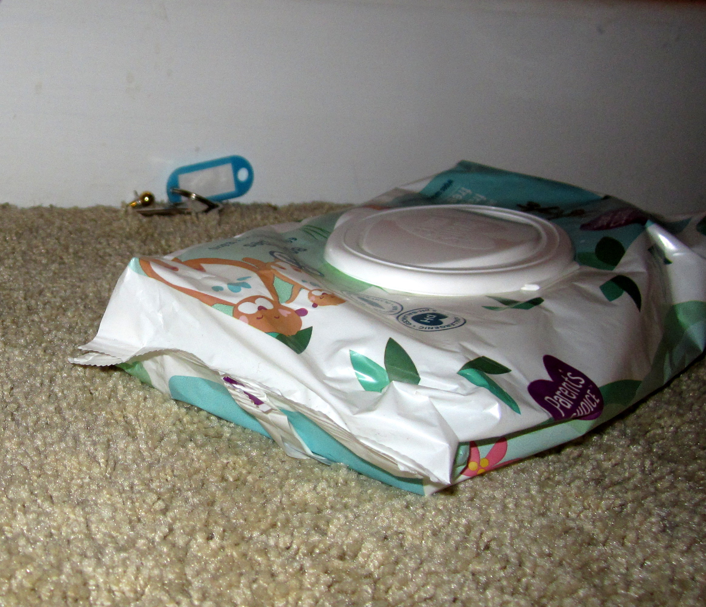 Under this particular dresser I store extra packs of wet wipes, the kind used for sticky toddler fingers and messy diapers. With my cheek pressed on the carpet and my arm stretched as far as it would go, I could barely touch them. But one by one, I pushed them aside. When I moved the very last package, there was the third earring—leaning on the church key.