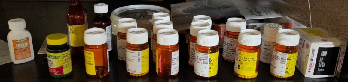 In less than a minute she had them all lined up on the exam room bench, grouped by category. The doctor was impressed (as were Nelson and I), and it turned out to be a big help to have the bottles there. Though this palliative expert had all these same drugs on a computer list in front of her, she quickly pivoted to the bench-with-bottles to study labels, count remaining pills, and ask questions about their efficacy.