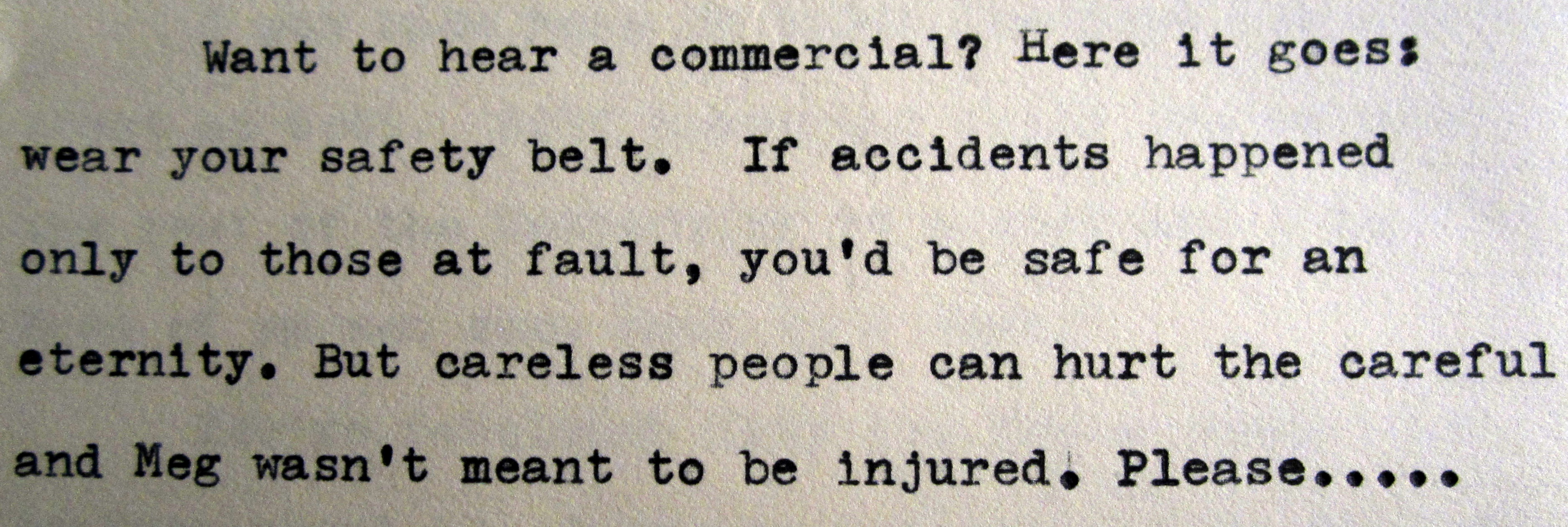 Feb. 1, 1969 – Dear Meg. I love you. Time in Chicago is fabulous because of you. Prayer leads us to Christ and He guides our relationship. Let’s remember that. And take good care of yourself. Wear seat belts. Get enough rest. I think of you often. Sometimes I look at the clock and think, what is she doing now?
