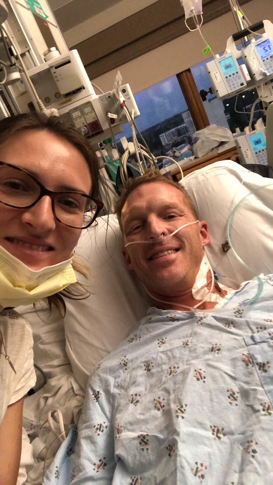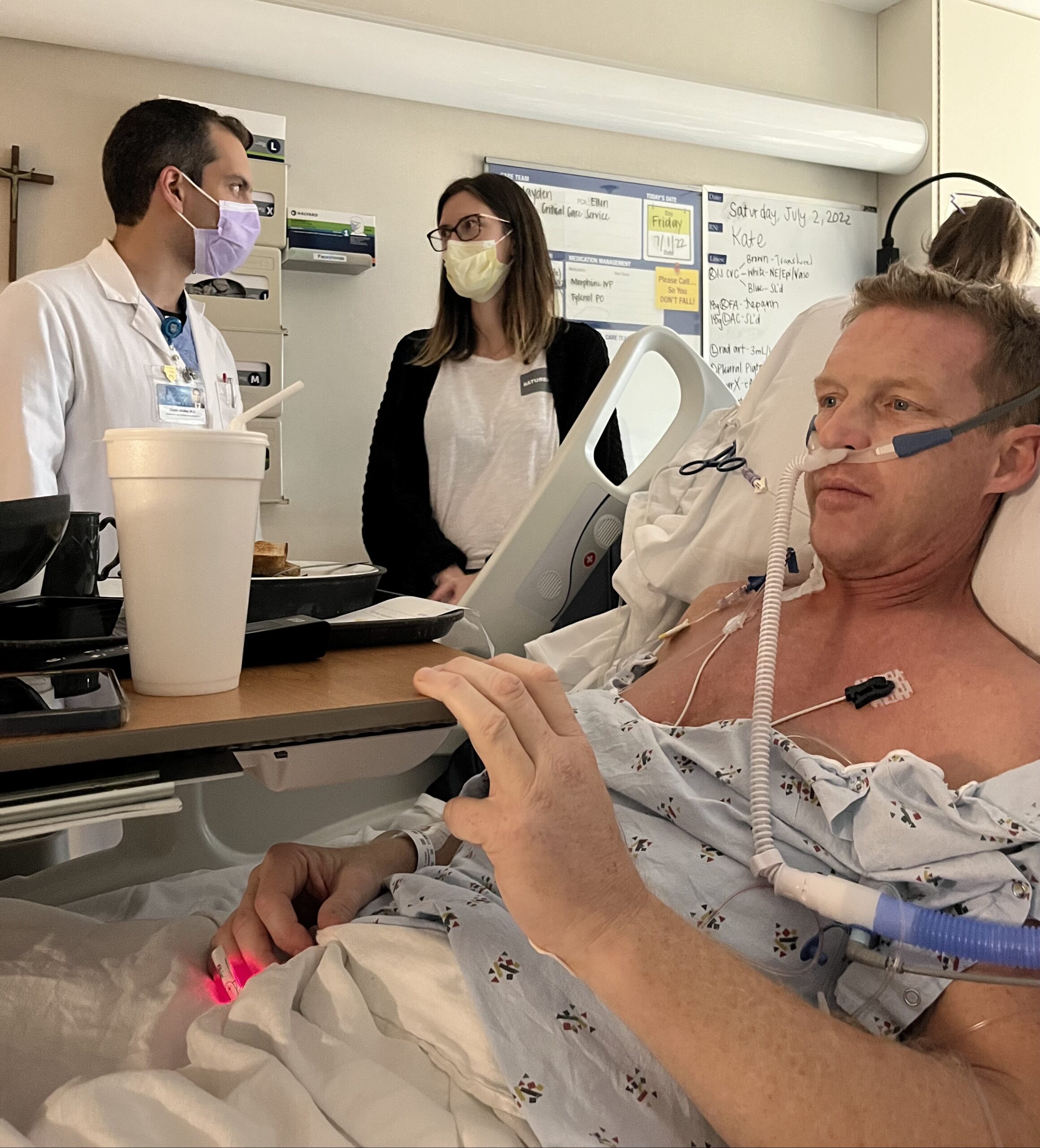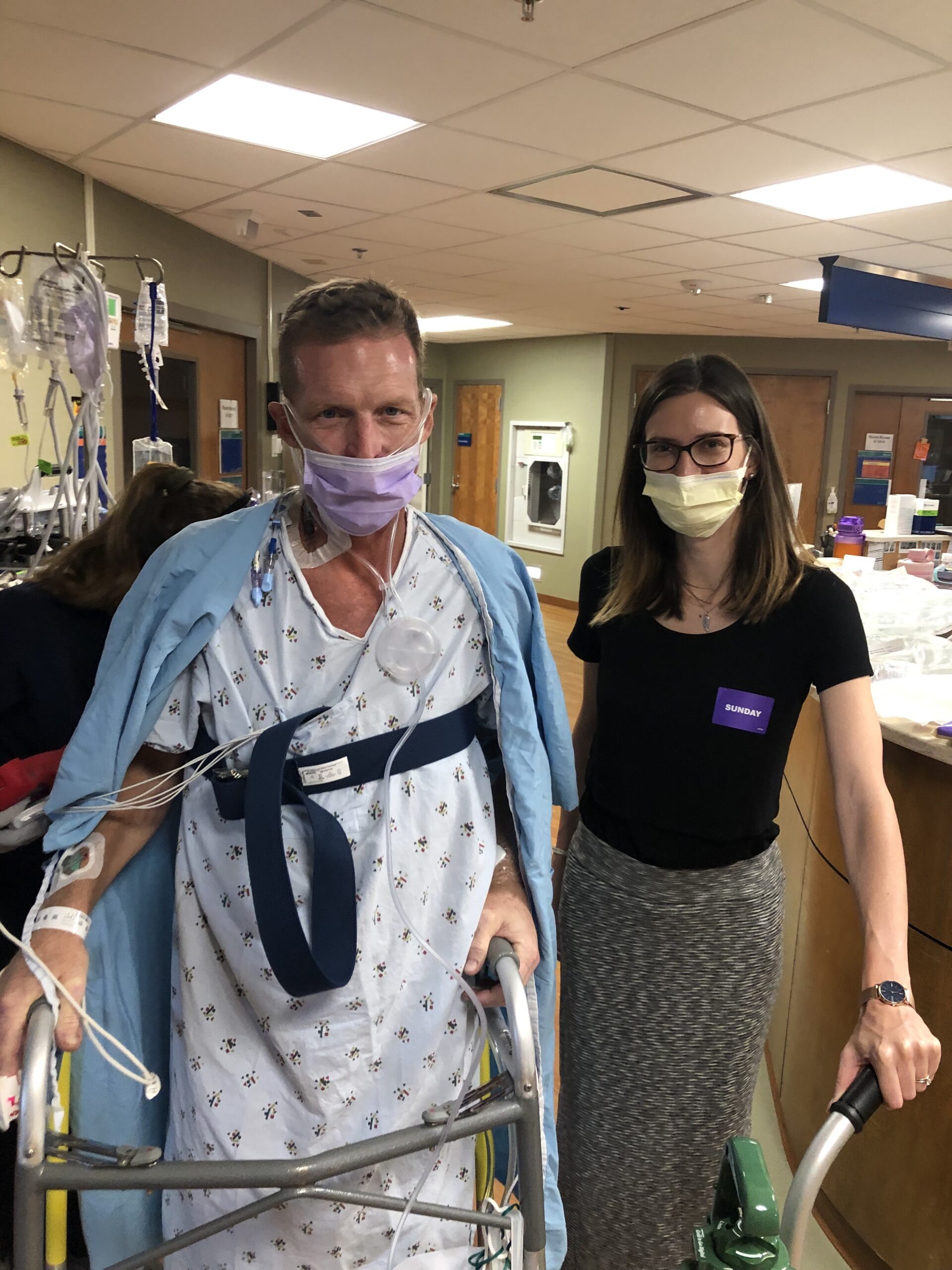 Nelson worked up a little sweat during his walk but was glad to be back on his feet. Best of all, he did it without the warmed, humidified oxygen he’s been using in the ICU, though he still needs a high concentration through the smaller cannula.