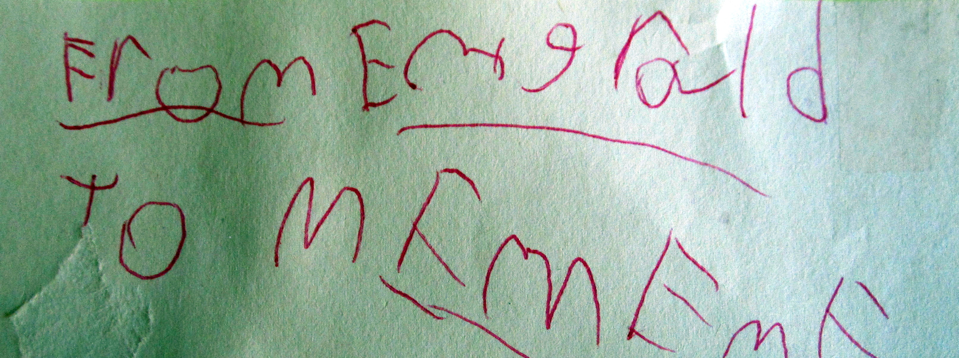 Emerald’s gift (to MeeMee) hangs with my most valuable necklaces. And as I wear it and hear comments about the upside-down “L”, I get to pass along the wisdom she taught me – something more valuable than the priciest jewelry.