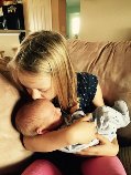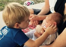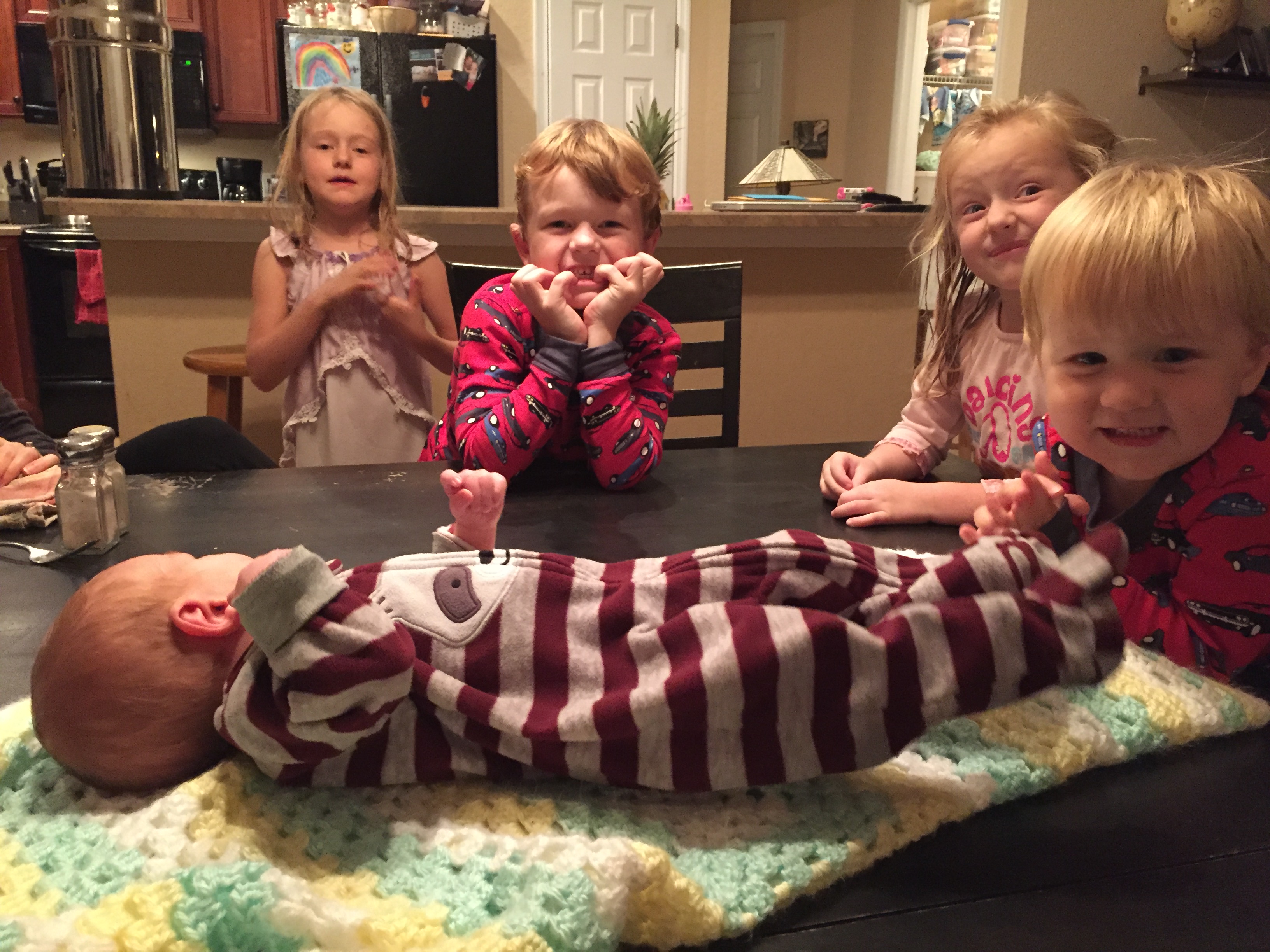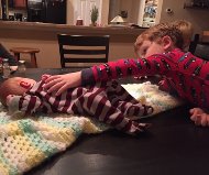 One of the things he can’t regulate is the flood of love pouring over him from the other children. Each of the baby’s siblings relates to their new little brother in different ways. But one thing they all have in common is wanting to touch him — kisses on the head, pats on the tummy, strokes on the hair, pokes, and taps.