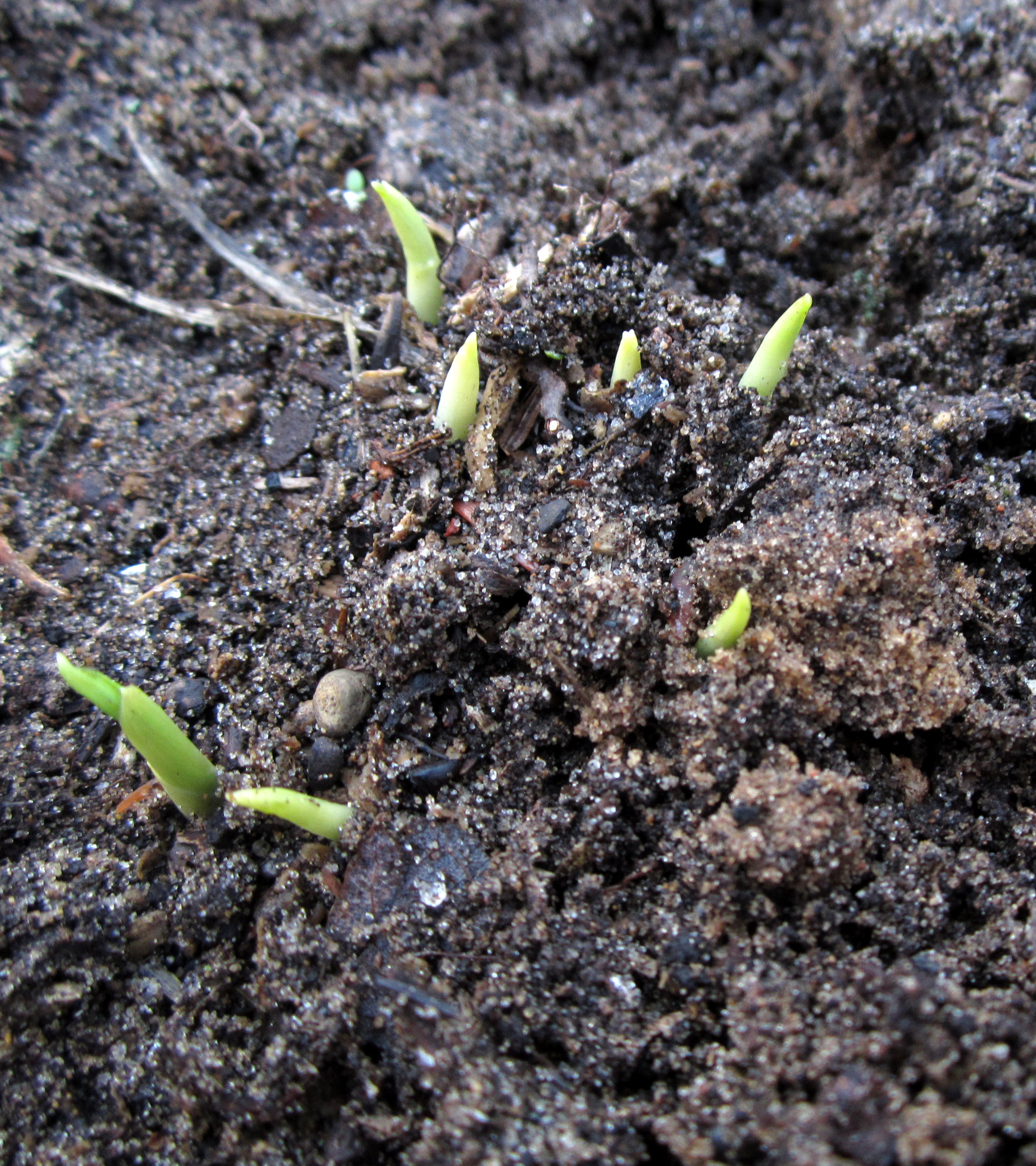 It was two weeks ago that I first began noticing other people’s perennials surfacing, but ours were still a no-show. I wondered if the transplant last October might have been too much for them. Or had they sat in my buckets too long between being uprooted and put under again?
