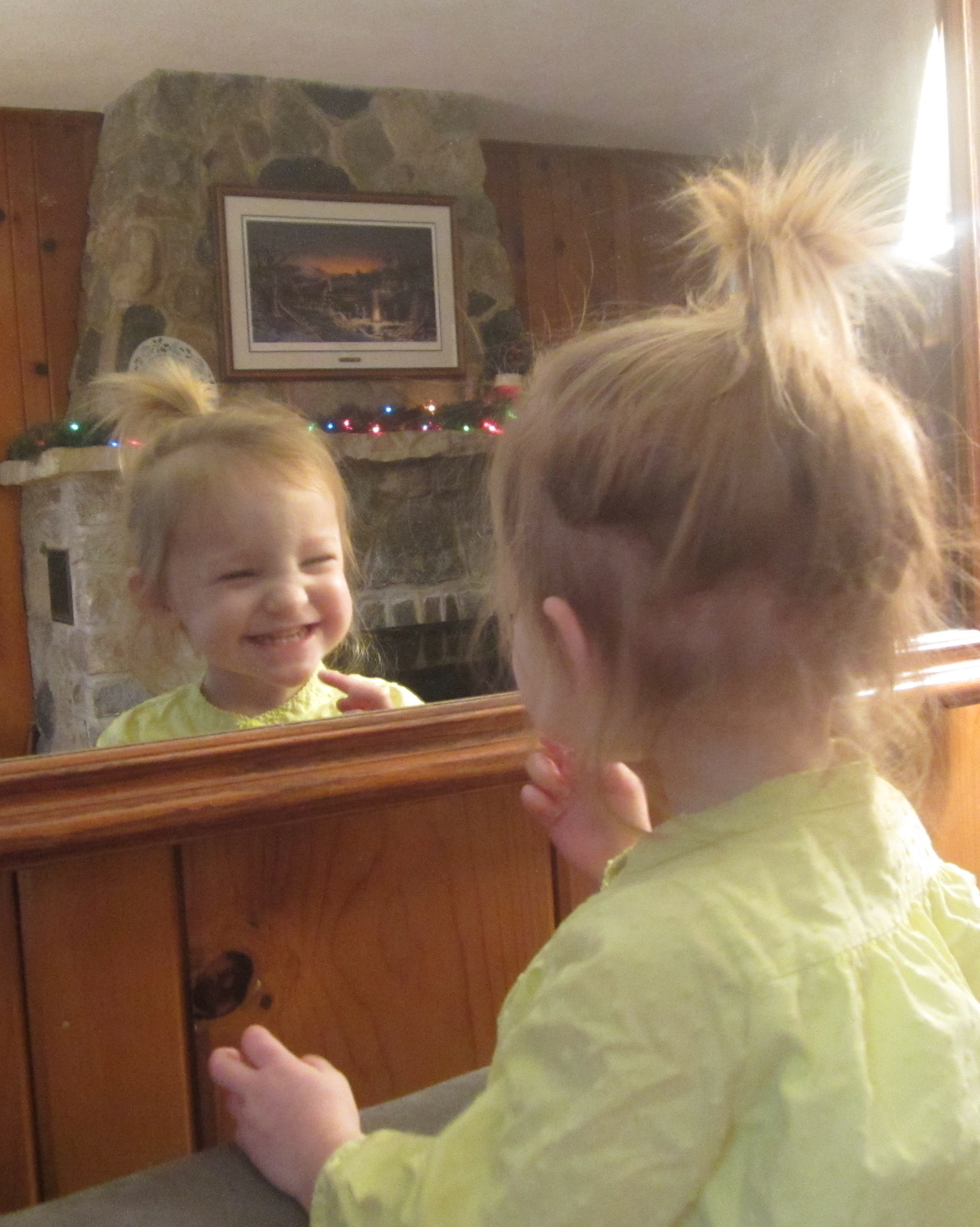 Once in a while she’ll crawl up on my couch just to gaze at herself in the mirror behind it, the only mirror she can reach. She’ll talk to her reflection, make faces, tip her head back and forth, and jump up and down, all while intently watching her mirror image. And she smiles long smiles at herself as if to say, “You, Emerald, are my very favorite!”