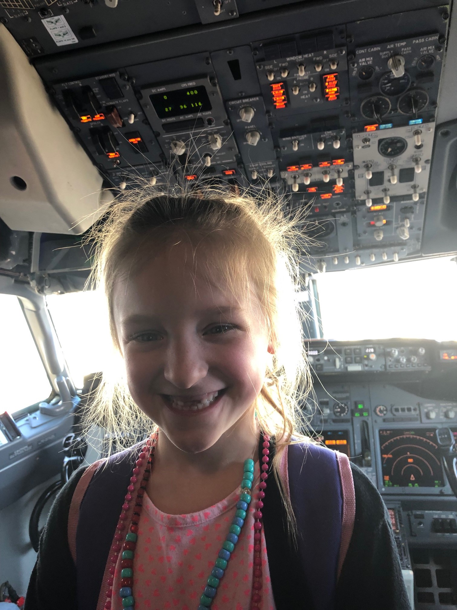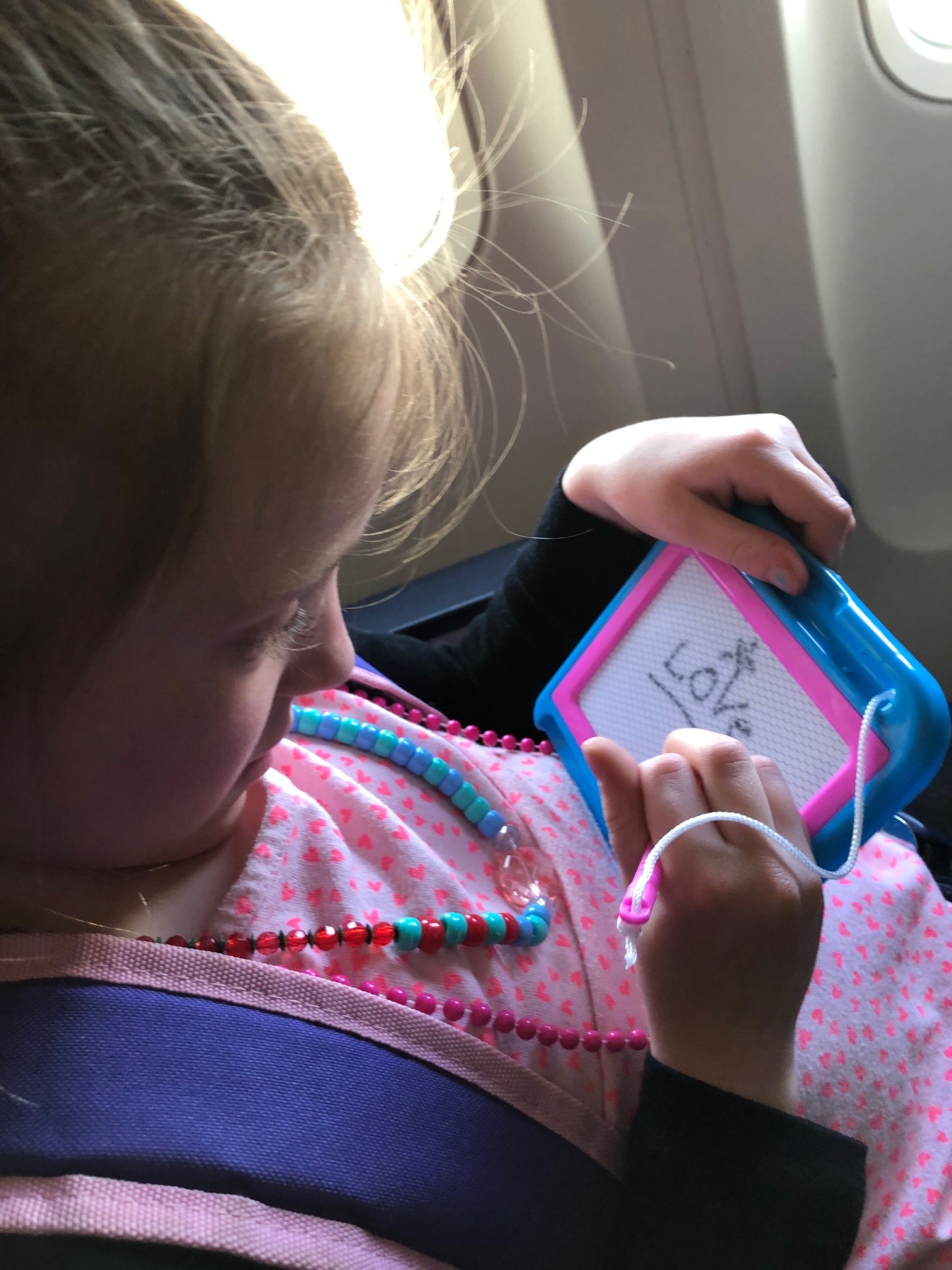 She climbed up next to me and looked at the baby, who was crying, too. I recited our flight plan again, but her response was off-topic. While wiping her eyes and studying May’s frown-y face, her own face brightened. “I know!” she said. “The pacifier!”