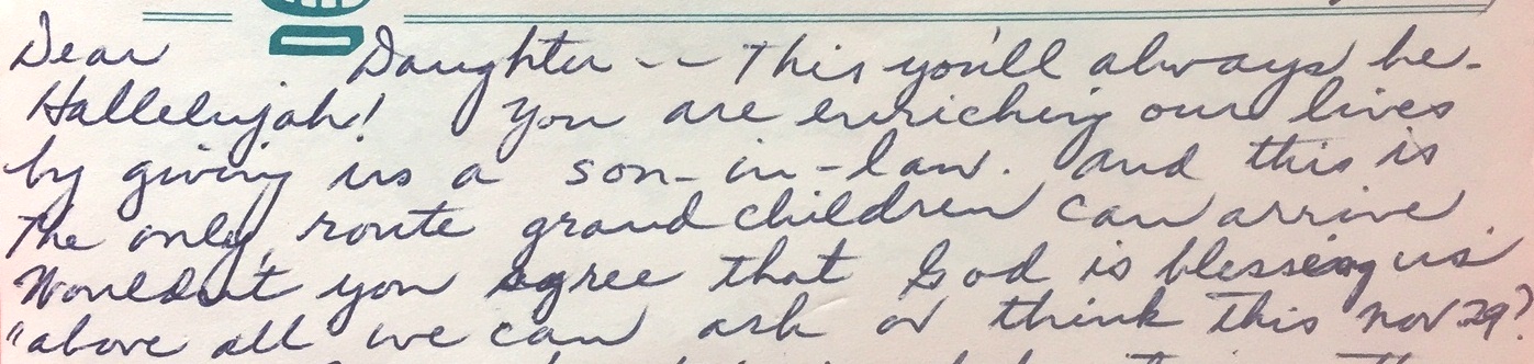 Dear Daughter – this you’ll always be. Hallelujah! You are enriching our lives by giving us a son-in-law. And this is the only route grandchildren can arrive. Wouldn’t you agree that God is blessing us “above all we can ask or think” this Nov. 29?
