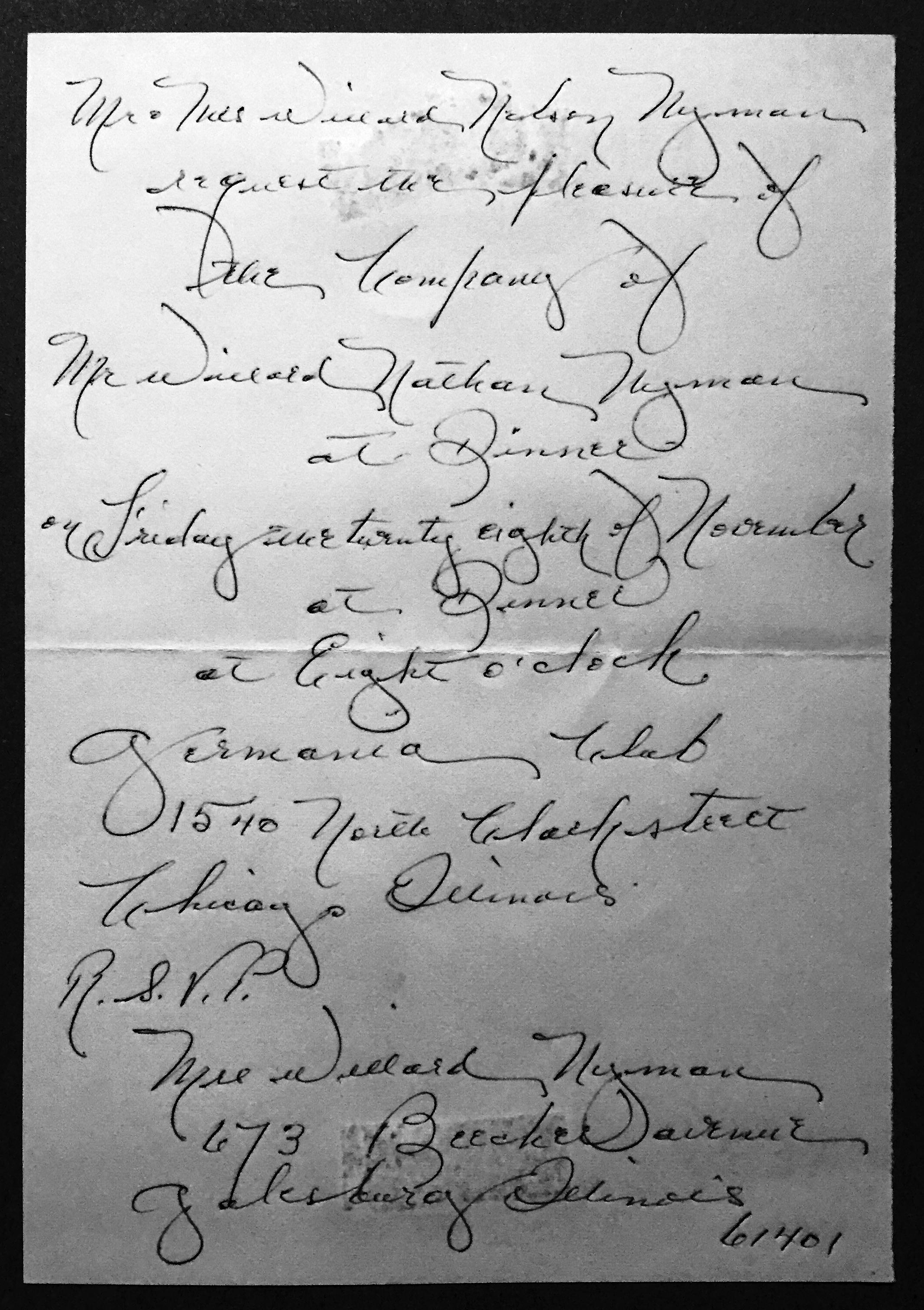 Gorgeous handwritingThe senior Nymans would be hosting our wedding rehearsal dinner at a club near Moody Church, close enough for us to walk after rehearsing. Nate’s father, who had a gorgeous script, had hand-written invitations for each family attending – more than 50 people, including the parents of the 4 former kindergartners who would be participating in the wedding. It would be a party unto itself, and we were grateful Nate’s folks were willing.