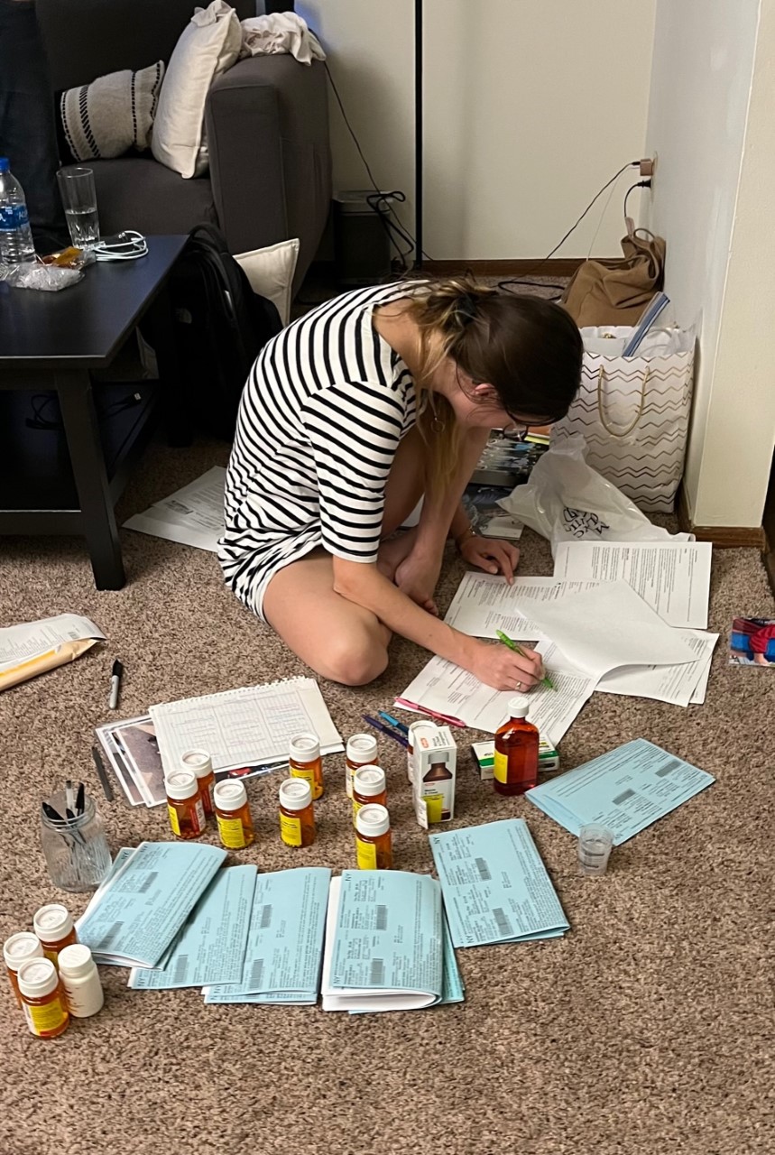 After a dinner of Ann Sophie’s delicious chunky-vegetable soup, we worked to figure out the prescriptions the hospital pharmacy sent home with us. Nelson and I threw in a comment or two, but it was Ann Sophie who had the pen and paper, marking bottles and her own chart. As Nelson said, “She’s the best person in the whole world.”